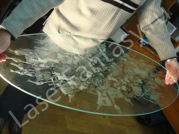 Столешница для журнального стола. Гравировка роз на прозрачном стекле. Полки и потолки, стены и полы, двери и перегородки из прозрачного стекла.