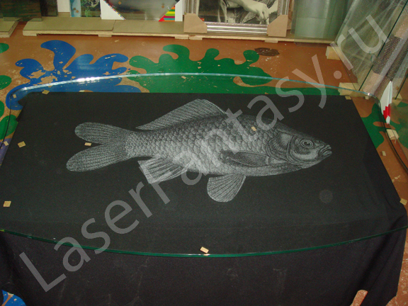 Столешница стеклянная. Гравировка рыбы. Столы. Журнальные столики.