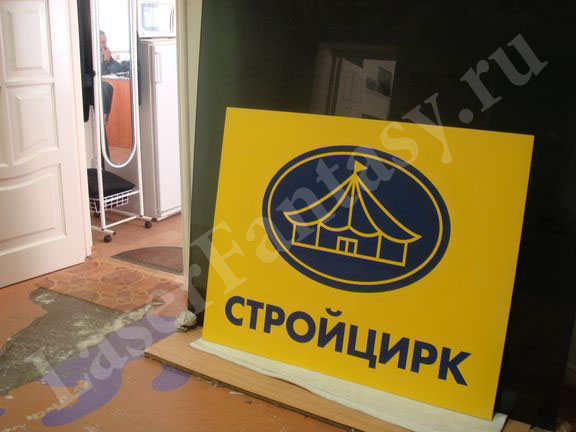 Лазерная гравировка по фанере с виниловым покрытием. Логотип "Стройцирк".